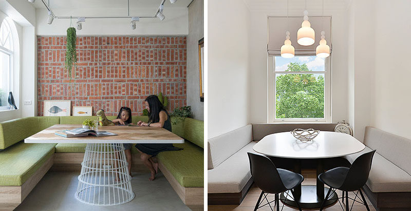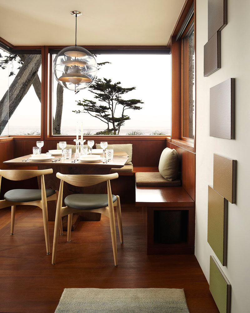 餐廳創意–內置的就餐角落是有效地填滿矩形空間的好方法,并確保你的家人都有座位。它們是長凳的舒適替代品,通常比一張簡單的桌子和椅子更能坐得下人。為了激發你自己的靈感,這里有8個干凈、現代、舒適的餐廳設計。這個內置的用餐區下沉到地板上,隱藏的抽屜整齊地塞在側面。大窗戶可以打開,讓你感覺像是在戶外用餐。