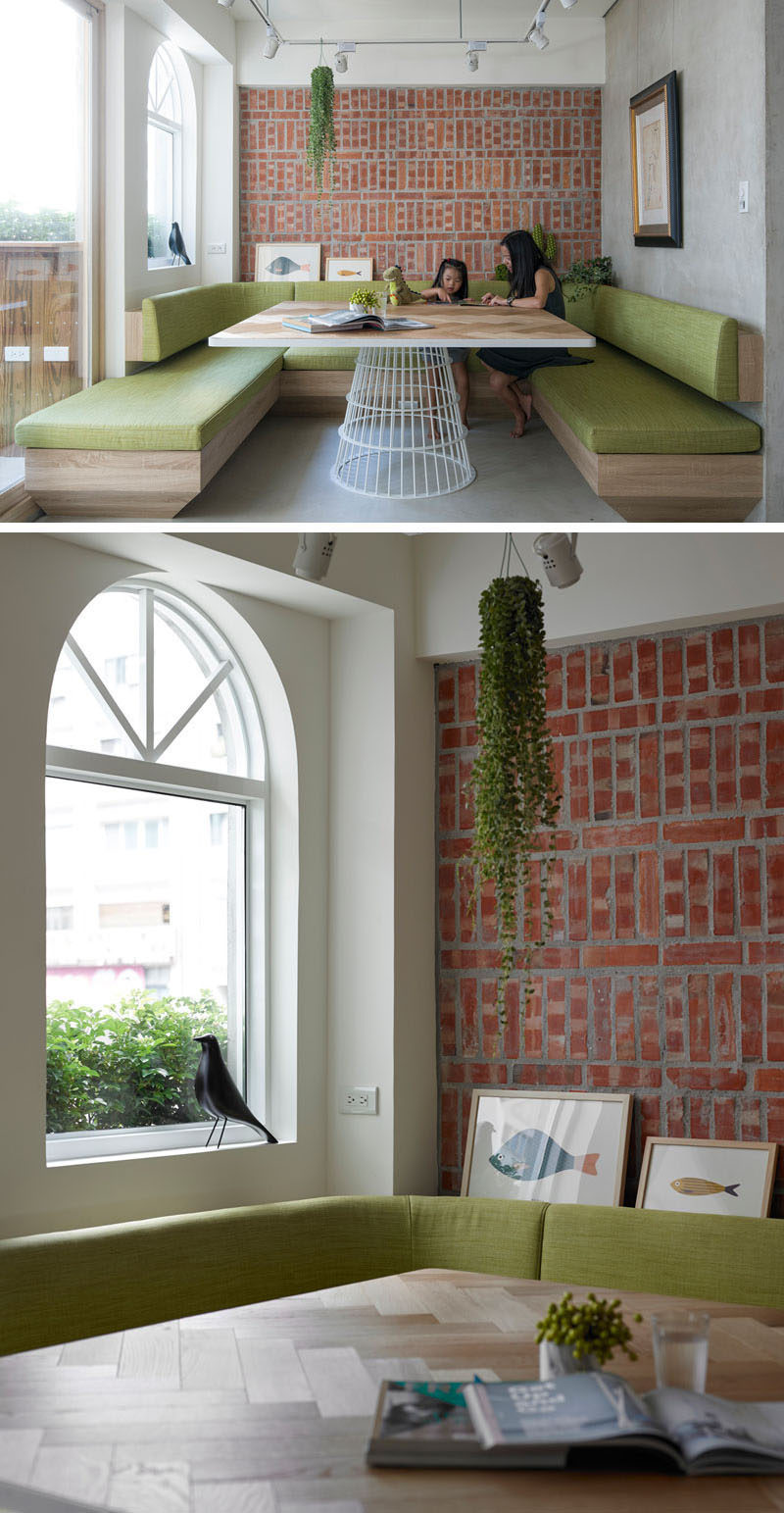 餐廳周圍的窗戶確保了餐桌上的每個人都能欣賞到窗外雨林的美景。有軟墊的靠墊被設計成與長椅的尺寸相匹配。在這里看到更多這個家的照片。輕質木材和柔軟的綠色靠墊使磚墻變得柔和,使這個用餐區成為一個安靜的地方,可以花時間吃飯或與朋友和家人聚會。由KC工作室設計。輕質木材和大窗戶使這個小餐廳成為一個明亮舒適的空間,而一面墻的架子和櫥柜將所有東西保持在一臂的距離。