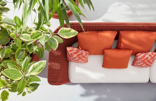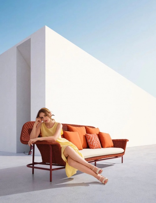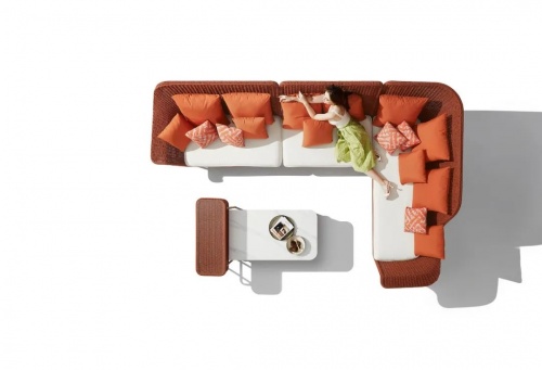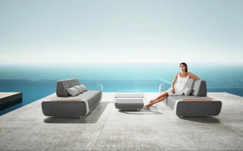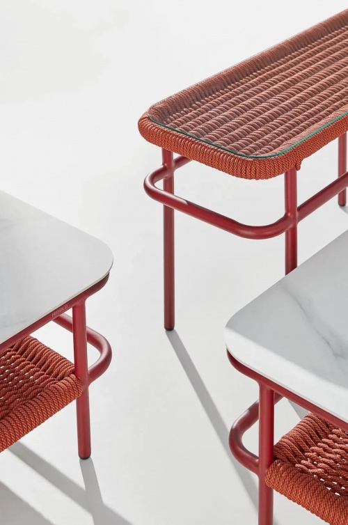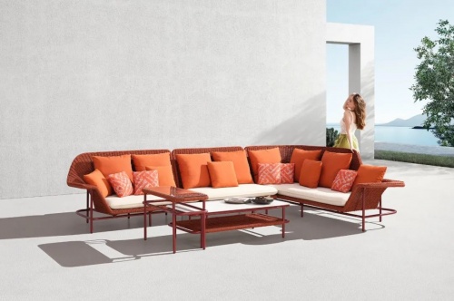 慷慨的比例,舒適和通風,基于一個堅實的和優雅的鋁框架基礎,一個彩色繩帶穿梭其中。技藝精湛的編織工匠把這份柔軟曲線呈現,一個邀請您體驗地中海式放松的扶手沙發應運而生。