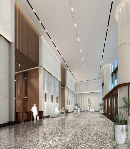 KWG商業設計團隊與知飾設計共同定制設計了5A寫字樓這座31層建筑的大堂、主廳、零售區域、標準層的設計方案,并為公共空間的設計建立了新的尺度及標準。墻身運用大理石折疊錯落的肌理感盡顯室內大堂的設計磅礴大氣,身臨其境可體驗空間的豁然放飛及尖端品位的空靈之感。