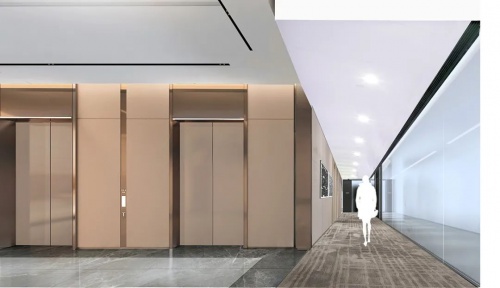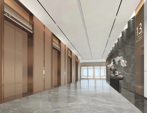 電梯大堂立面的復雜折疊賦予了材質之間不同定點的獨特連接。為了在視覺上使立面更纖細和統一,團隊設計了精巧的金屬外殼系統,在同色古銅金屬材質采用不同紋理及肌理搭配,完美地整合了結構連接的視覺弱點。纖細的設計語言突出視覺高度,回應了幕墻的古銅色和高品質愿景。