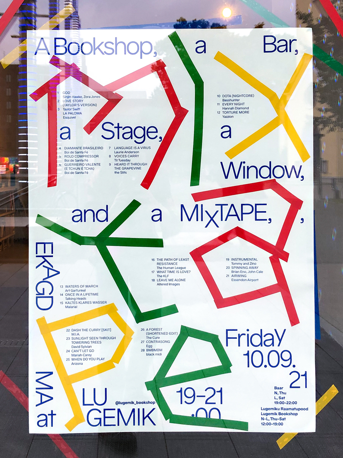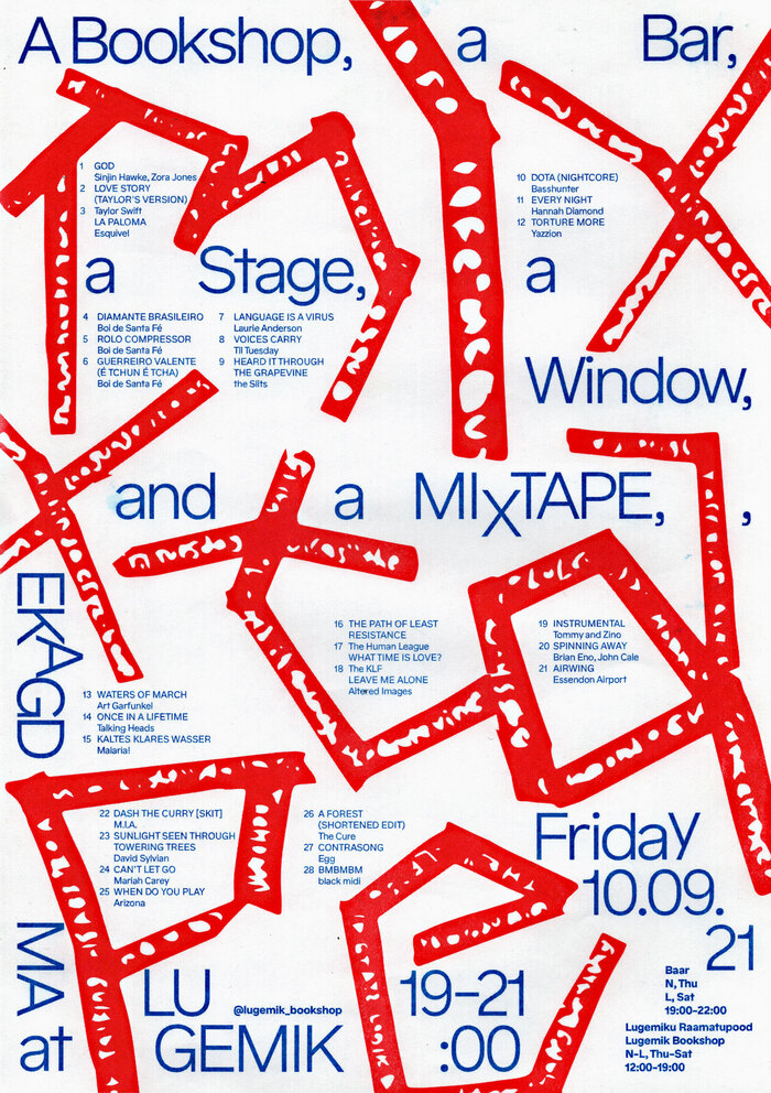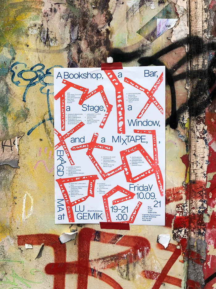 海報由米里亞姆·哈姆和馬克·福斯設計,使用墨西哥的漢澤利奇尼,宣布這個活動引用了書店,酒吧,舞臺,一個窗口,和一個混合錄音,在愛沙尼亞塔林的Lugemik書店展示。